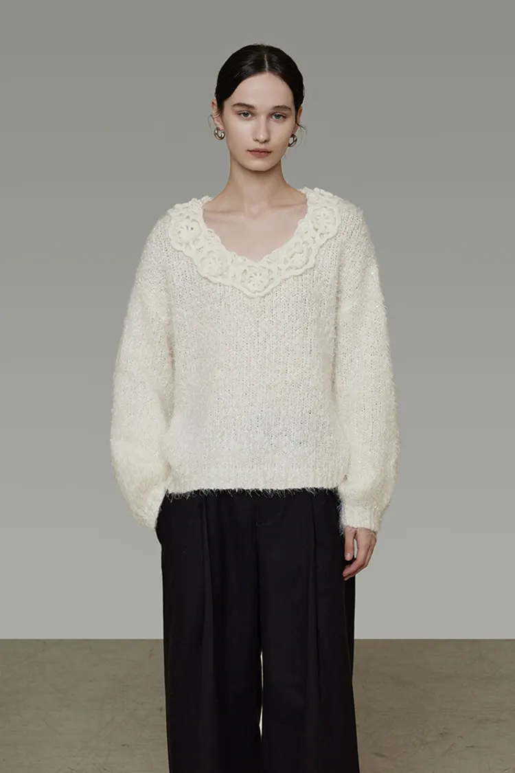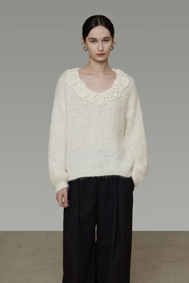 Damski sweter z koronką 3D ma głęboki dekolt w kształcie litery V. Brzeg dekoltu ozdobiony jest wykwintną haftowaną ażurową koronką, uzupełnioną drobnymi guzikami z tej samej tkaniny. Trójwymiarowy kunszt koronki jest wyraźnie warstwowy, z delikatnymi i miękkimi detalami. Ogólny wygląd jest słodki, romantyczny, a jednocześnie elegancki. Niezależnie od tego, czy patrzy się na niego z przodu, czy z tyłu, ma on silne wyczucie designu, dzięki czemu podstawowy sweter w jednolitym kolorze przełamuje monotonię i bez wysiłku podkreśla wyrafinowanie stroju. Jest bardzo odpowiedni dla konsumentów ceniących detale i fakturę.