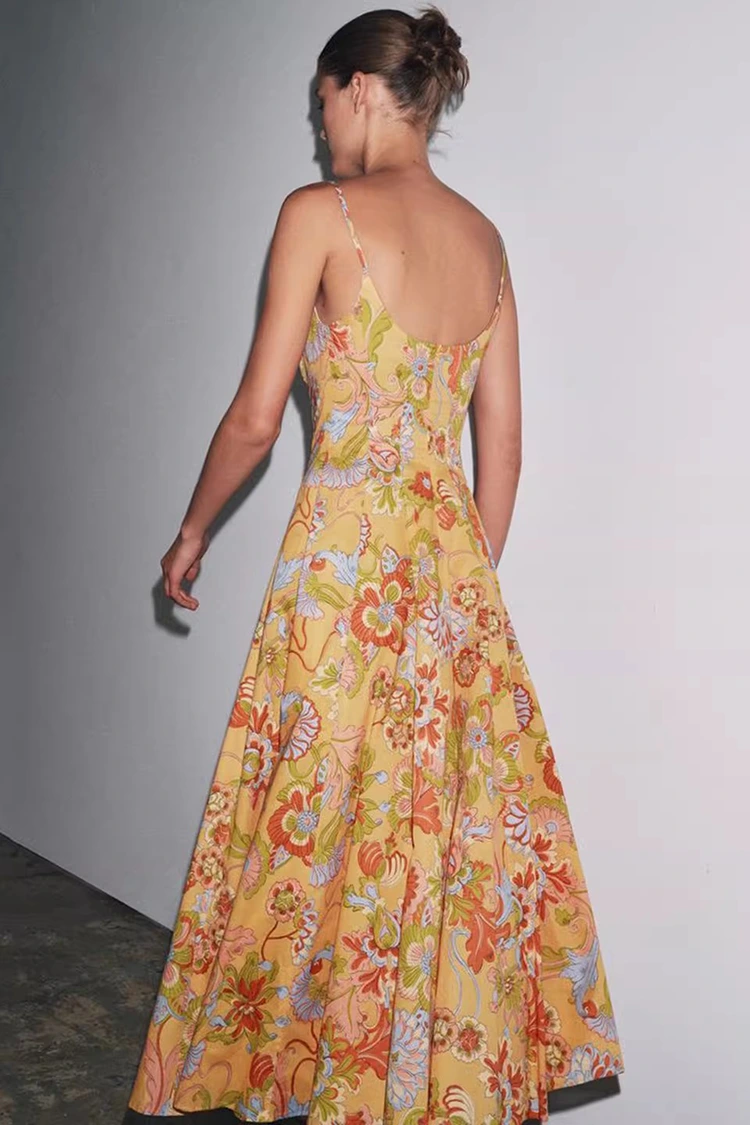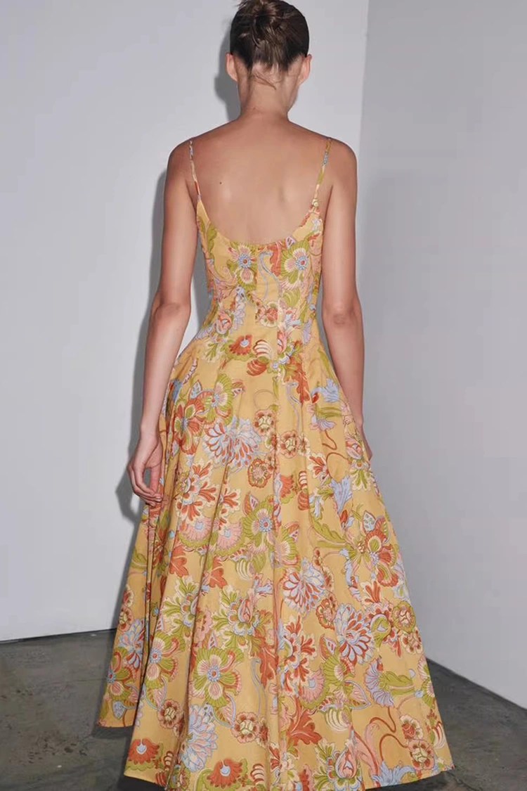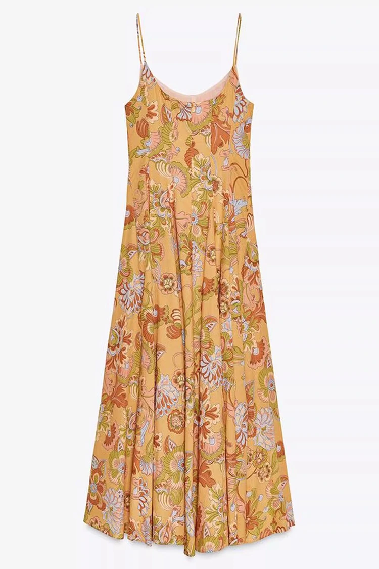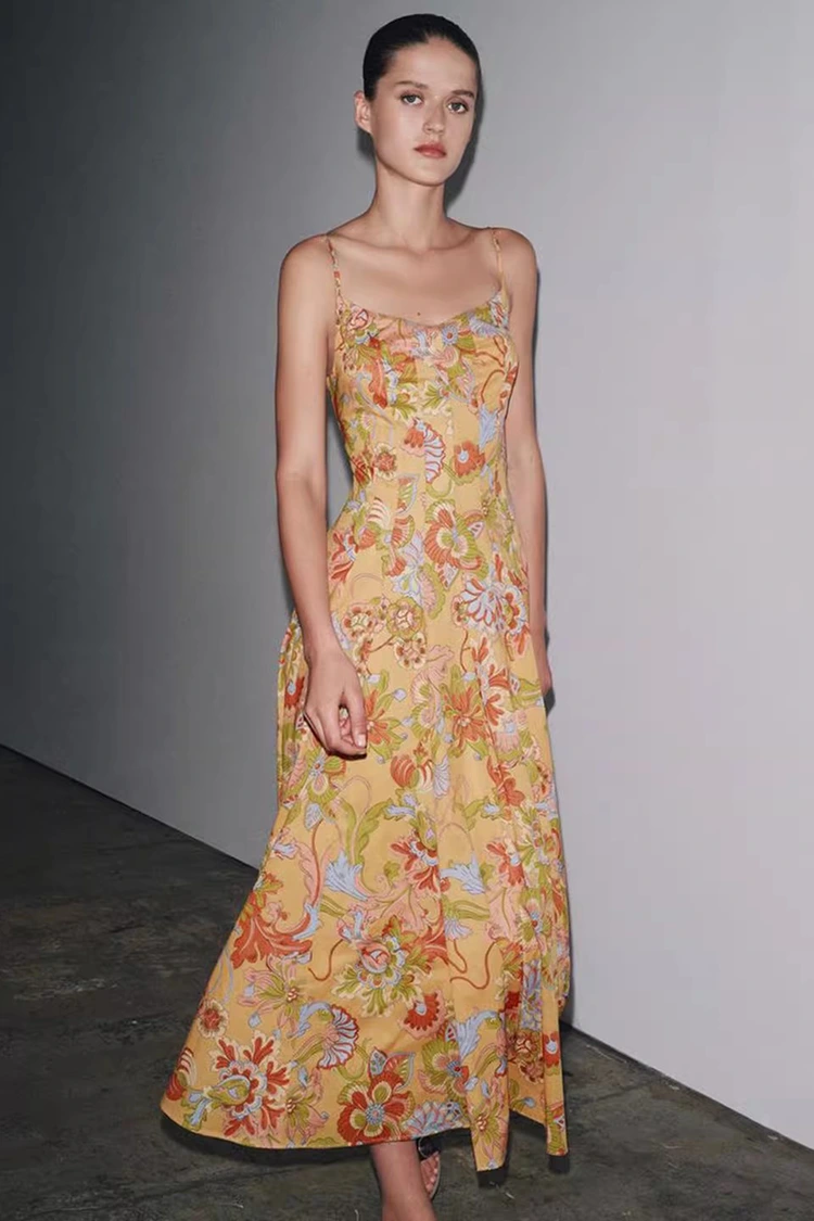 Damska bawełniana letnia sukienka w kwiaty ma bazowy kolor jasnopomarańczowy z bogato teksturowanymi kwiatowymi nadrukami pokrywającymi całą powierzchnię. Ciepłe i miękkie odcienie dodają witalności, jak gdyby na ciele noszony był cały kwitnący letni ogród. Łączy w sobie romantyczną atmosferę retro z letnią atmosferą relaksu. Sylwetka charakteryzuje się fasonem bez rękawów i zawieszonym pod szyją, o czystych i orzeźwiających liniach, które umiejętnie eksponują linie ramion i szyi, proporcjonalnie kształtują sylwetkę, a jednocześnie wyrywają się z ograniczeń krótkich rękawów, spełniając wymogi ubierania się gorącego lata. Dół spódnicy jest luźny i umiarkowany, nie wybredny co do kształtu ciała, z łatwością zakrywa drobne mankamenty w talii, brzuchu i nogach, będąc bardzo przyjaznym kobietom o każdej budowie ciała. Idealne połączenie retro printu i smukłej sylwetki pozwala tej sukience nie tylko podkreślić kobiecy wdzięk, ale także zachować swobodny i swobodny styl, przełamując ograniczenia jednego stroju i dopasowując się do różnych stylów kreacji.