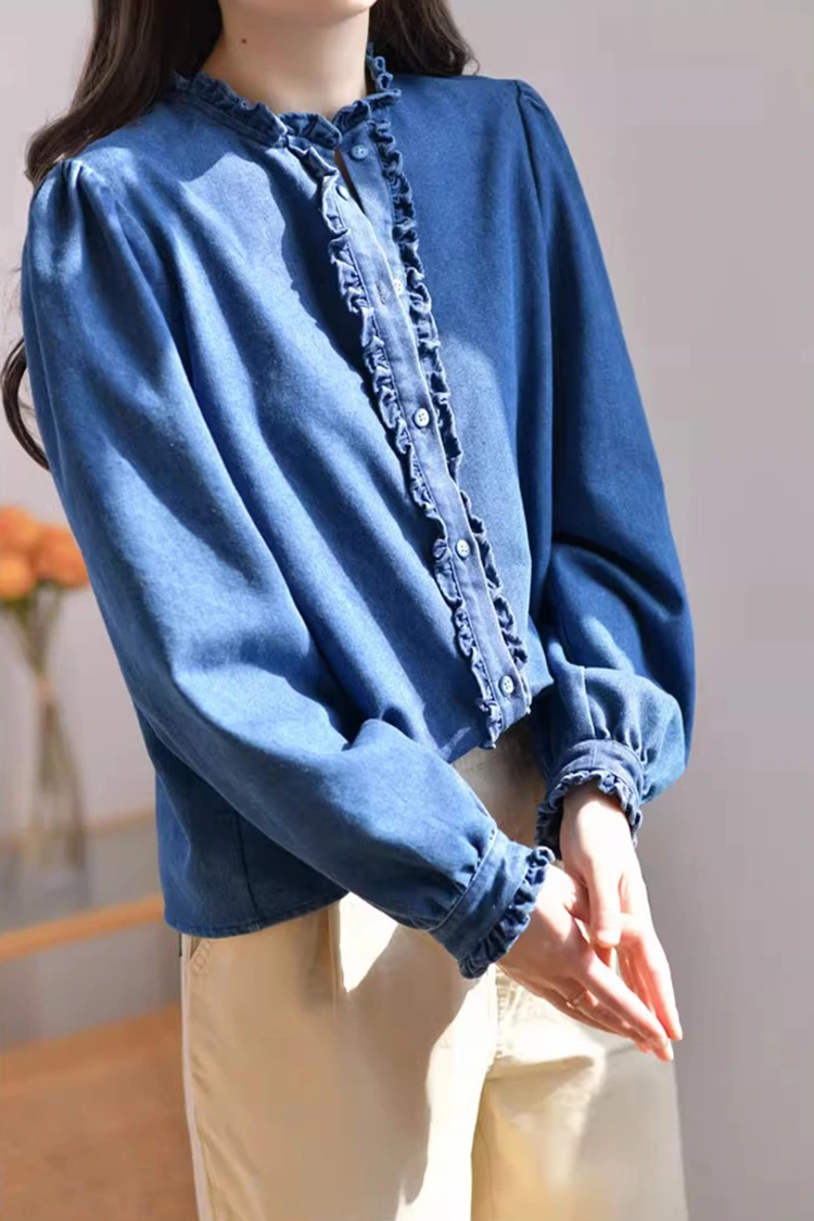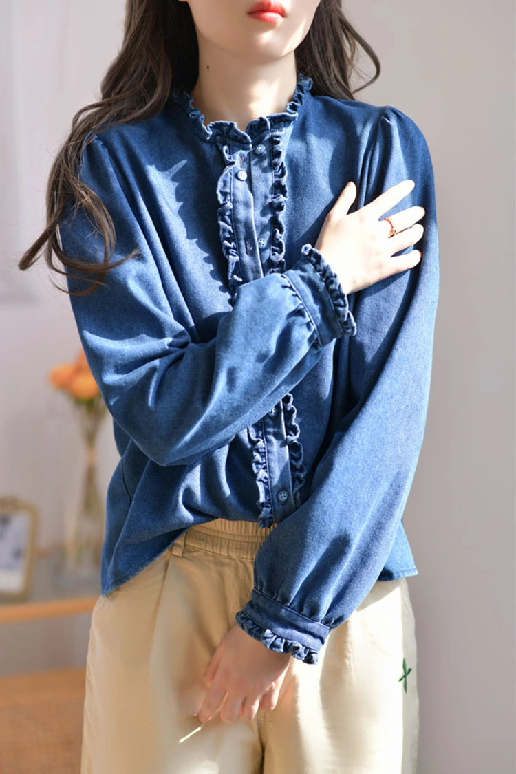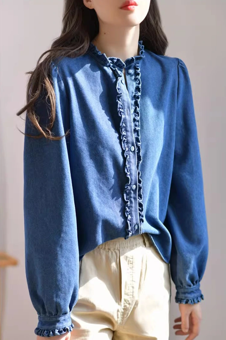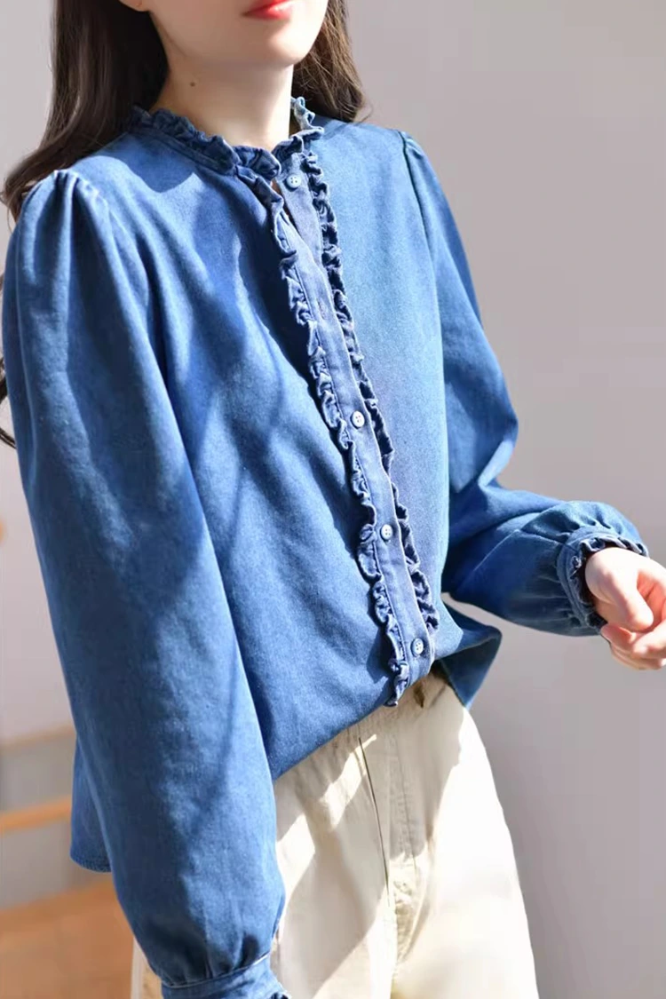 Damska dżinsowa bluzka casualowa ma styl retro i swobodny, precyzyjnie dopasowując się do kształtu kobiecego ciała. Nie zależy to od typu sylwetki i może nie tylko wymodelować linię ramion i szyi, ale także ukryć nadmiar tłuszczu w talii i brzuchu. Zaspokaja potrzeby różnych typów budowy ciała. Kołnierzyk ma formę stójki, w połączeniu z wykwintnymi marszczonymi krawędziami. Przód i mankiety również ozdobione są delikatnymi marszczeniami. W połączeniu z puszystymi długimi rękawami w kształcie latarni, doskonale łączy w sobie retro elegancję i swobodną swobodę. Prosty wzór w jednolitych kolorach jest klasyczny i trwały i nie wyjdzie z mody. Może stworzyć codzienny, swobodny styl lub prosty styl biznesowy i jest bardzo praktyczny.