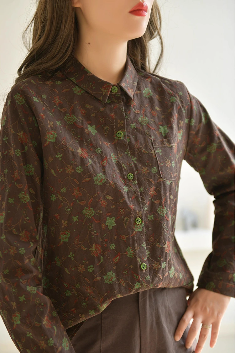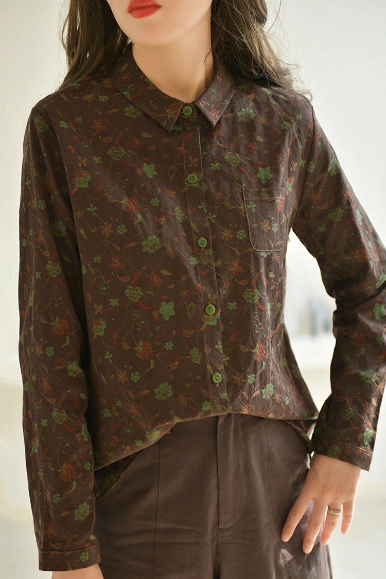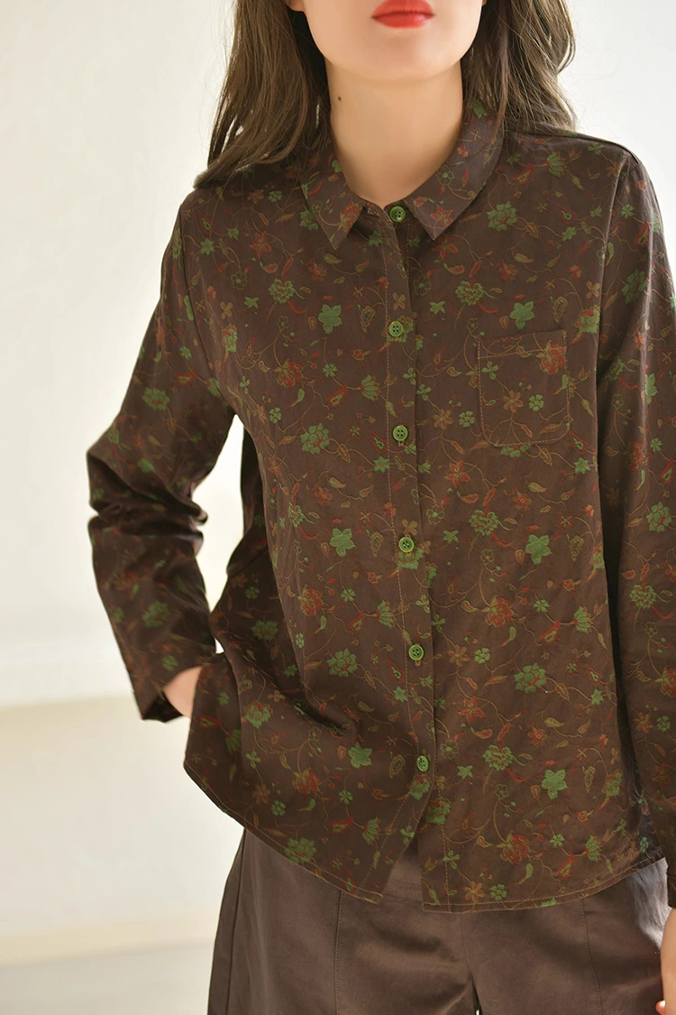 Damska bluzka casualowa z kwiatowym nadrukiem ma estetykę retro, która jest przeznaczona na rynek europejski i amerykański. Precyzyjnie oddaje dążenie lokalnych konsumentów do stylu artystycznego i retro, uwzględniając jednocześnie inkluzywność wzoru. Koszulka ma ciemnobrązowy kolor bazowy i jest pokryta nadrukami w stylu retro w winorośl. Odcień kolorów jest stabilny i wspaniały, tworząc elegancką artystyczną atmosferę. Różni się od zwykłych drukowanych stylów, może szybko wyróżnić się spośród podobnych produktów i stworzyć przewagę wyróżniającą sklep. Wzór przyjmuje prosty krój z małymi klapami, który jest prosty i elegancki oraz pasuje do swobodnego stylu ubierania się w Europie i Ameryce. Luźna konstrukcja ramion jest przyjazna dla różnych typów sylwetki i może skutecznie modyfikować szerokość ramion, talię i brzuch, nie jest wybredna pod względem kształtu ciała, odpowiednia dla konsumentów o różnych typach sylwetki w Europie i Ameryce, znacznie poszerzając grono odbiorców sprzedaży terminalowej i poprawiając wskaźnik zwrotów zakupów.