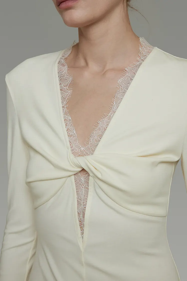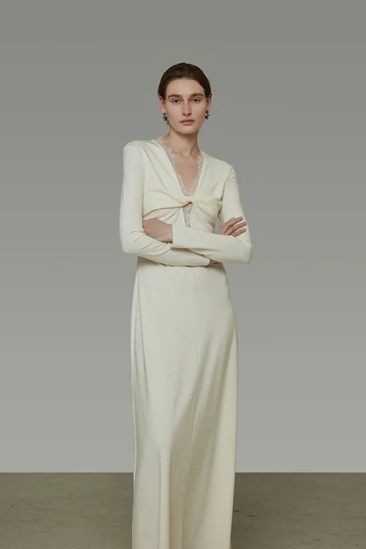 Koronka wzdłuż dekoltu w kształcie litery V jest starannie zabezpieczona ręcznie schludnym szwem blokującym, płynnie integrując się z sylwetką sukienki.