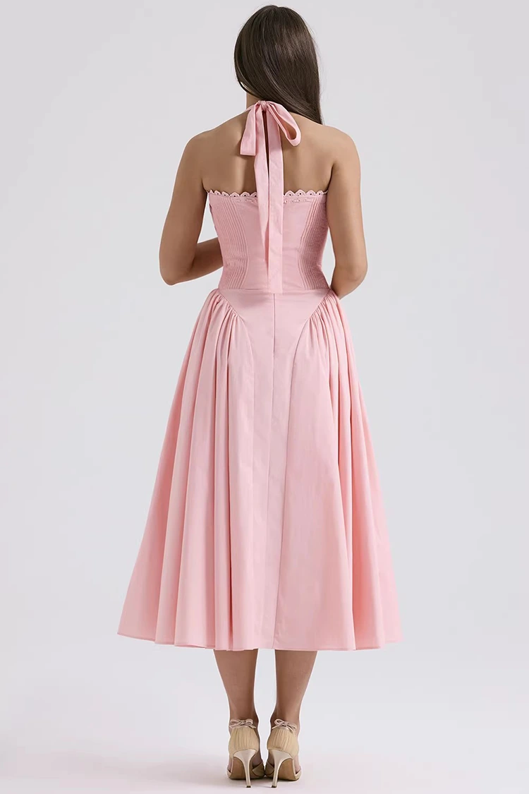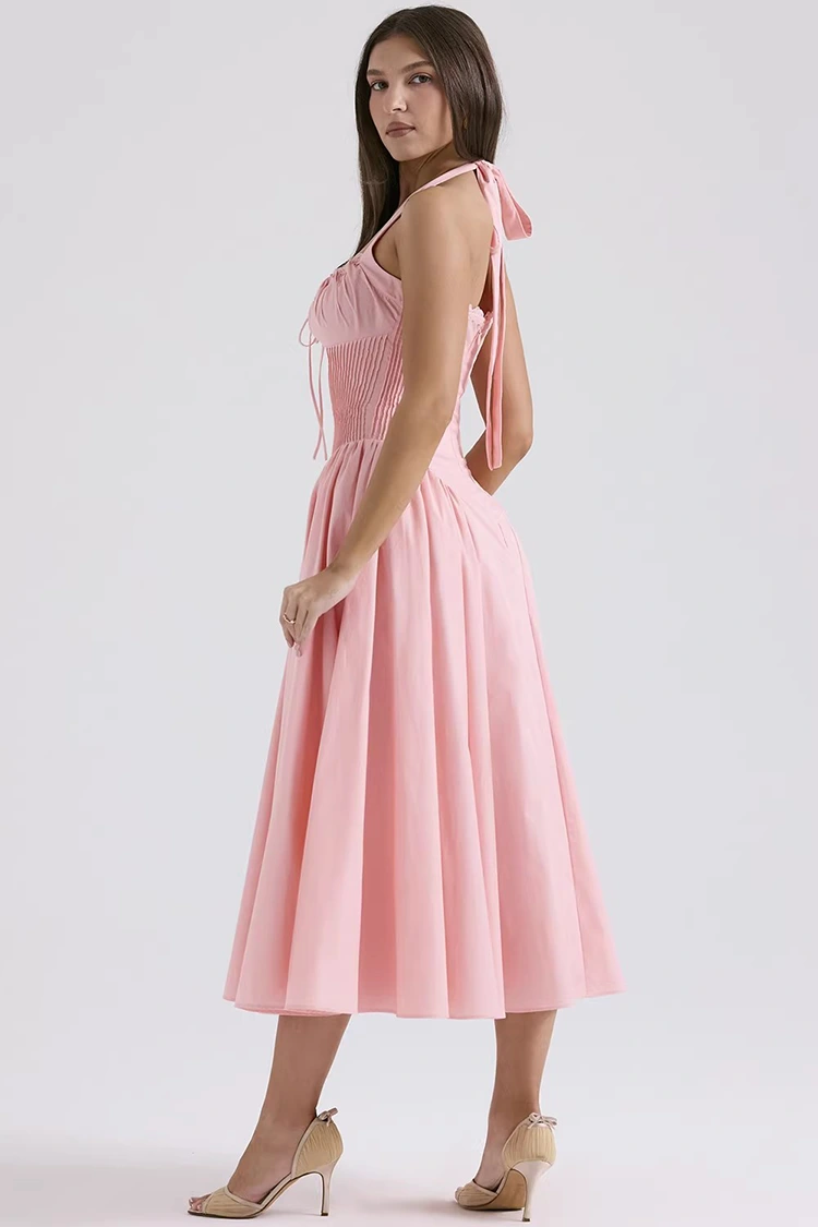 Ta damska różowa bawełniana sukienka MIDI ma delikatny i marzycielski brzoskwiniowo-różowy kolor, z delikatnym odcieniem, który nie powoduje podrażnień skóry. Skutecznie rozświetla cerę, nadając jej romantyczny i młodzieńczy klimat. Jednocześnie łączy w sobie retro elegancję i nowoczesne elementy mody. Wiązanie przy dekolcie można dowolnie regulować, zaciągając lub rozluźniając, co pozwala umiejętnie zarysować delikatną linię ramion i szyi, tworząc pełną atmosferę. Talia typu fishbone w górnej części dobrze dopasowuje się do ciała i nie powoduje uczucia ucisku. Potrafi subtelnie wyszczuplić sylwetkę, podkreślając talię i krągłości brzucha. Zakładki po obu stronach pozwalają ukryć niewielki tłuszczyk w talii i na brzuchu, dzięki czemu są bardzo przyjazne dla różnych typów sylwetki. Styl średniej długości w połączeniu z krojem bez rękawów zapewnia gładką, lekką i zwinną linię podczas chodzenia. Własna sztywność materiału zapewnia dobre wsparcie dla kształtu rybiej ości, zapobiegając jej zmiękczeniu lub odkształceniu, a także równoważąc piękno i wygodę.