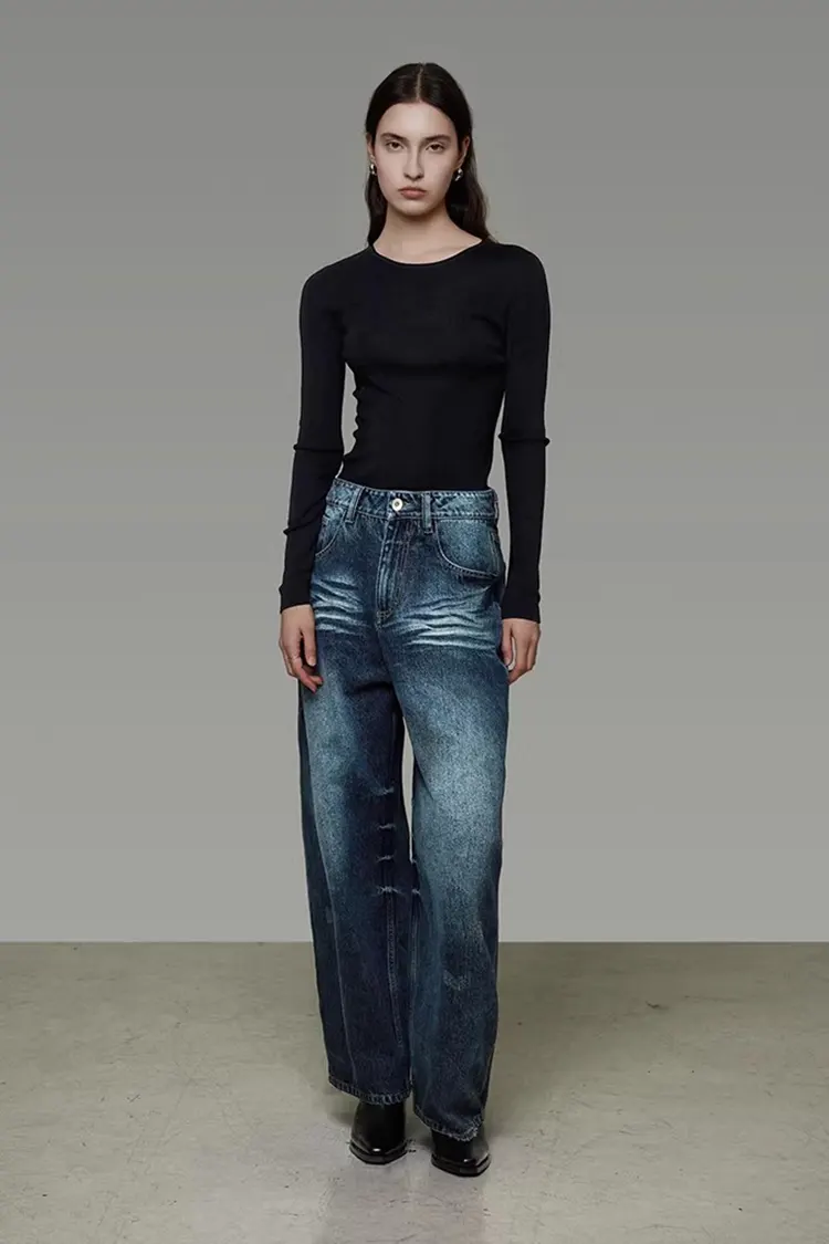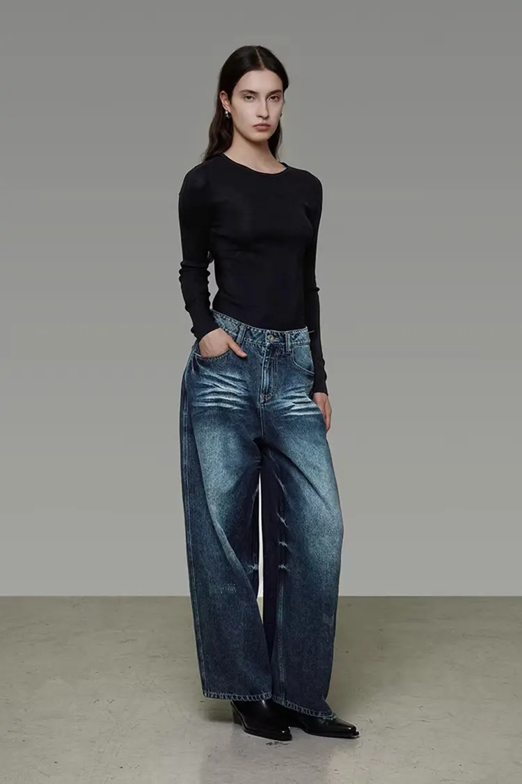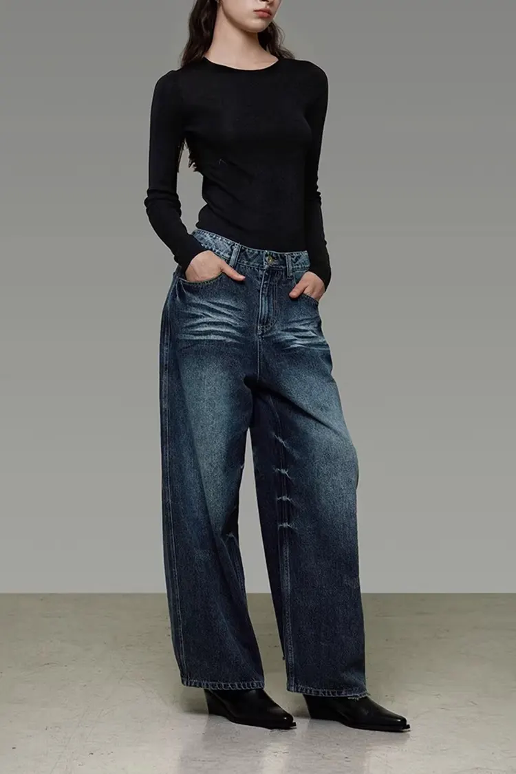Damskie spodnie z szerokimi nogawkami spranego dżinsu mają klasyczny krój z wysokim stanem w połączeniu z luźnym krojem z szerokimi nogawkami. Zapewnia wyjątkowo duże pokrycie nóg i może w naturalny sposób ukryć drobne niedoskonałości nóg. Spodnie naturalnie opadają od pasa w dół, płynąc z wdziękiem i swobodnie podczas chodzenia. Ogólny wygląd jest schludny, nie jest uciążliwy ani nadęty. Może wydłużyć linie nóg i stworzyć swobodny i elegancki styl retro. Nadaje się zarówno do odzieży roboczej, jak i do noszenia na co dzień.